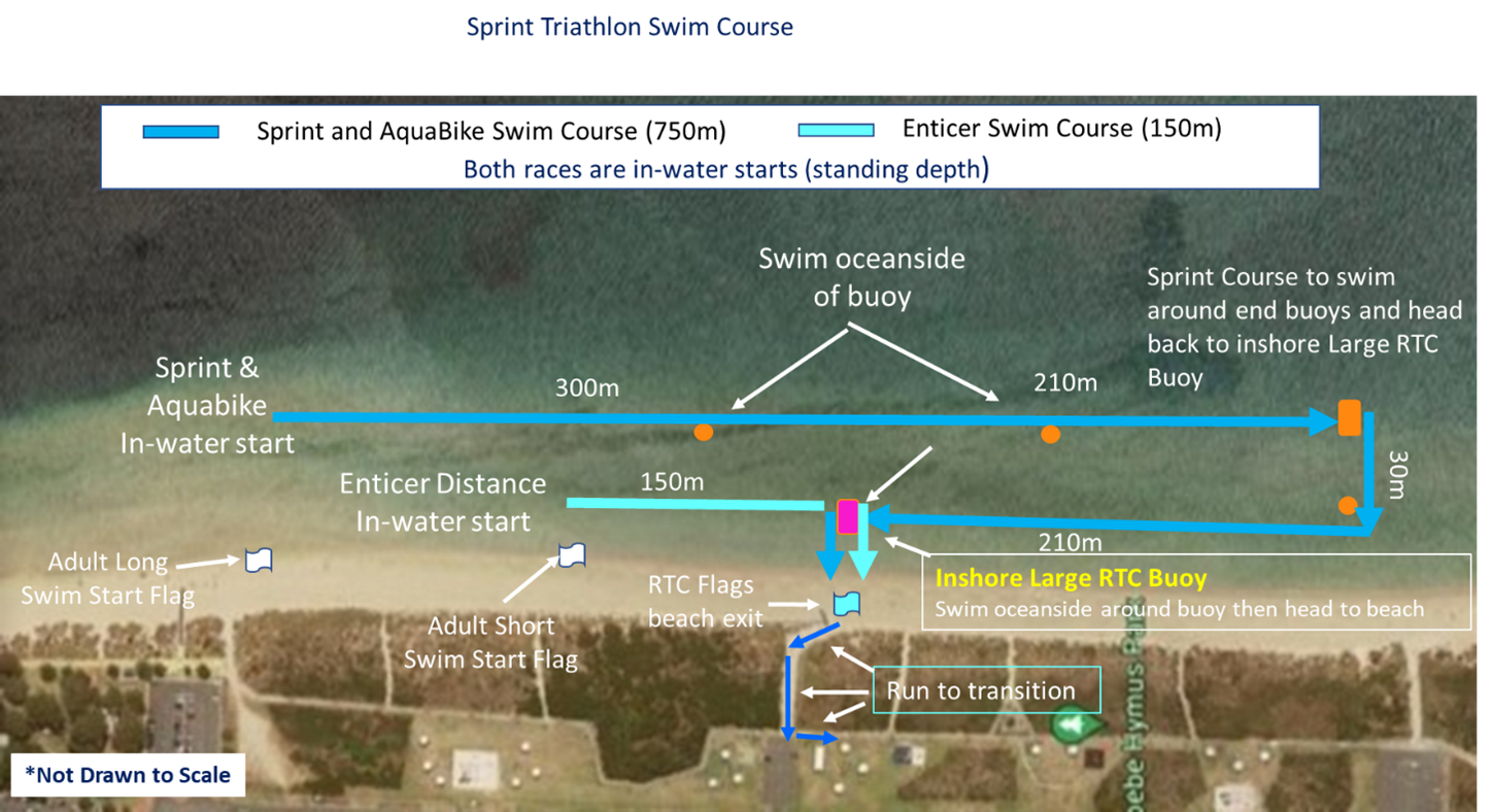 Sprint Distance and AquaBike competitors will start 300m up the beach and swim a total of 510m down to a large orange buoy, keeping to the outside of the buoys turn towards the beach and swim 30m to a small buoy. Turn at this small buoy then swim back up the beach 210m to the near-shore large orange buoy. Keeping this buoy on your left side swim around the large buoy and then head to the beach exit.